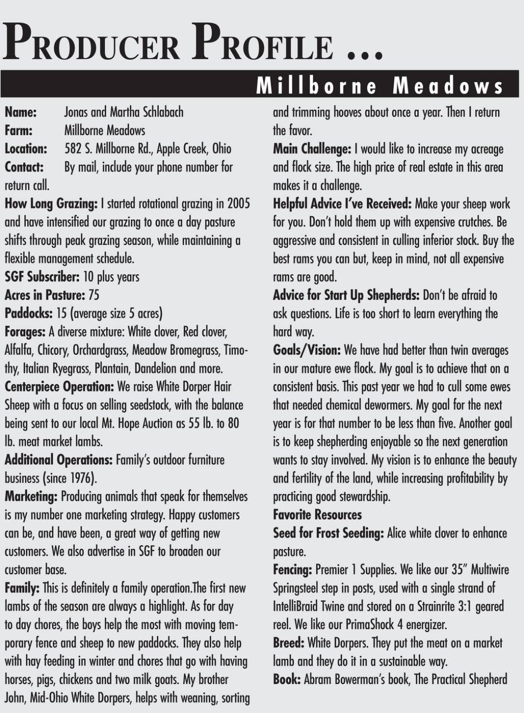 The Stockman Grass Farmer is a reader-driven magazine.  Not only do we like to receive suggestions for articles from our readers we also love to receive articles written by our readers.  We are always looking for producers wiling to share their experiences. What you have learned can be valuable information for someone starting out in grassfed production.   Please send any submissions to SGFSAMPLE@AOL.COM.  We're happy to send you our Writers' Guidelines if you'll drop us an email.